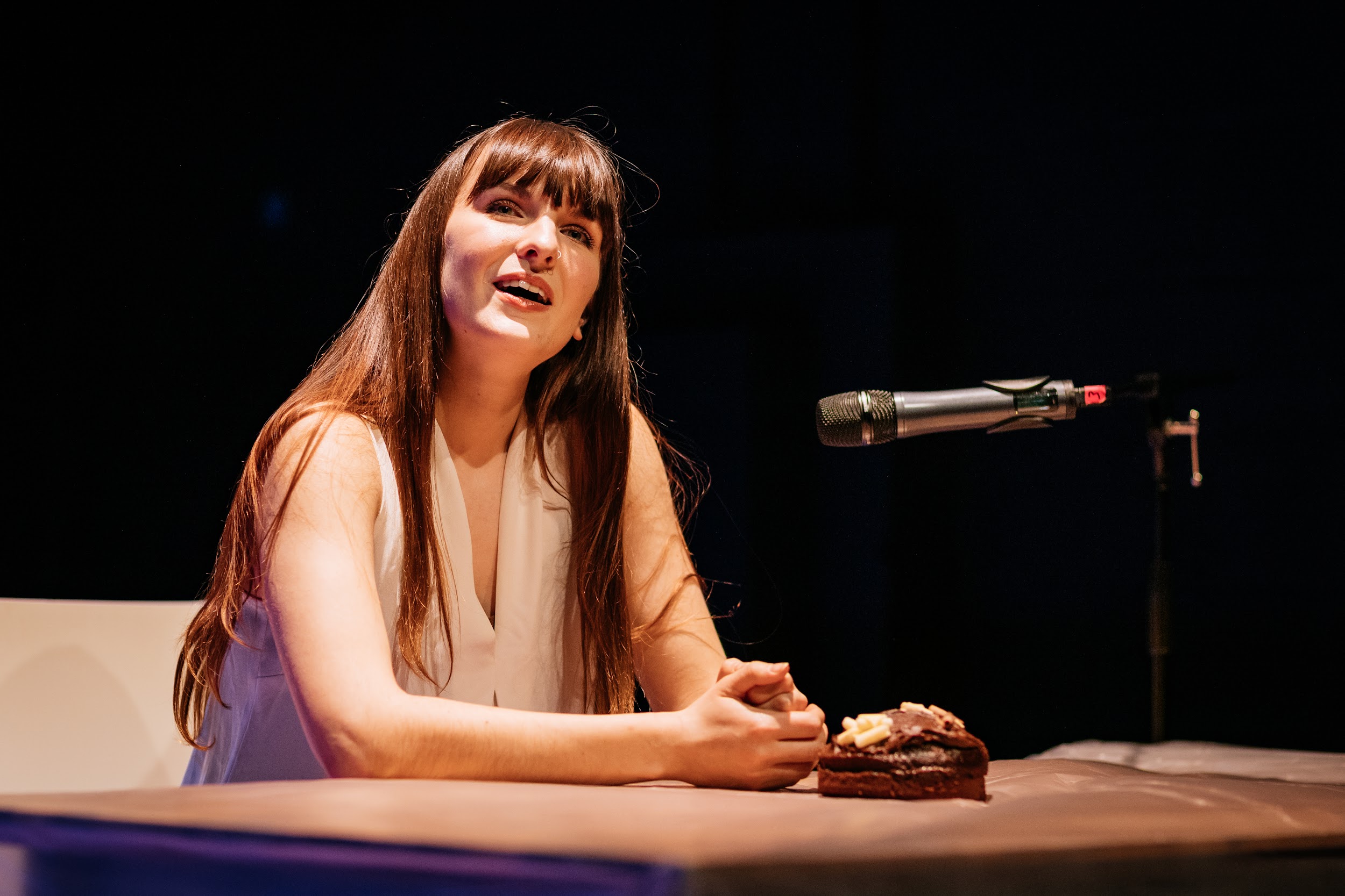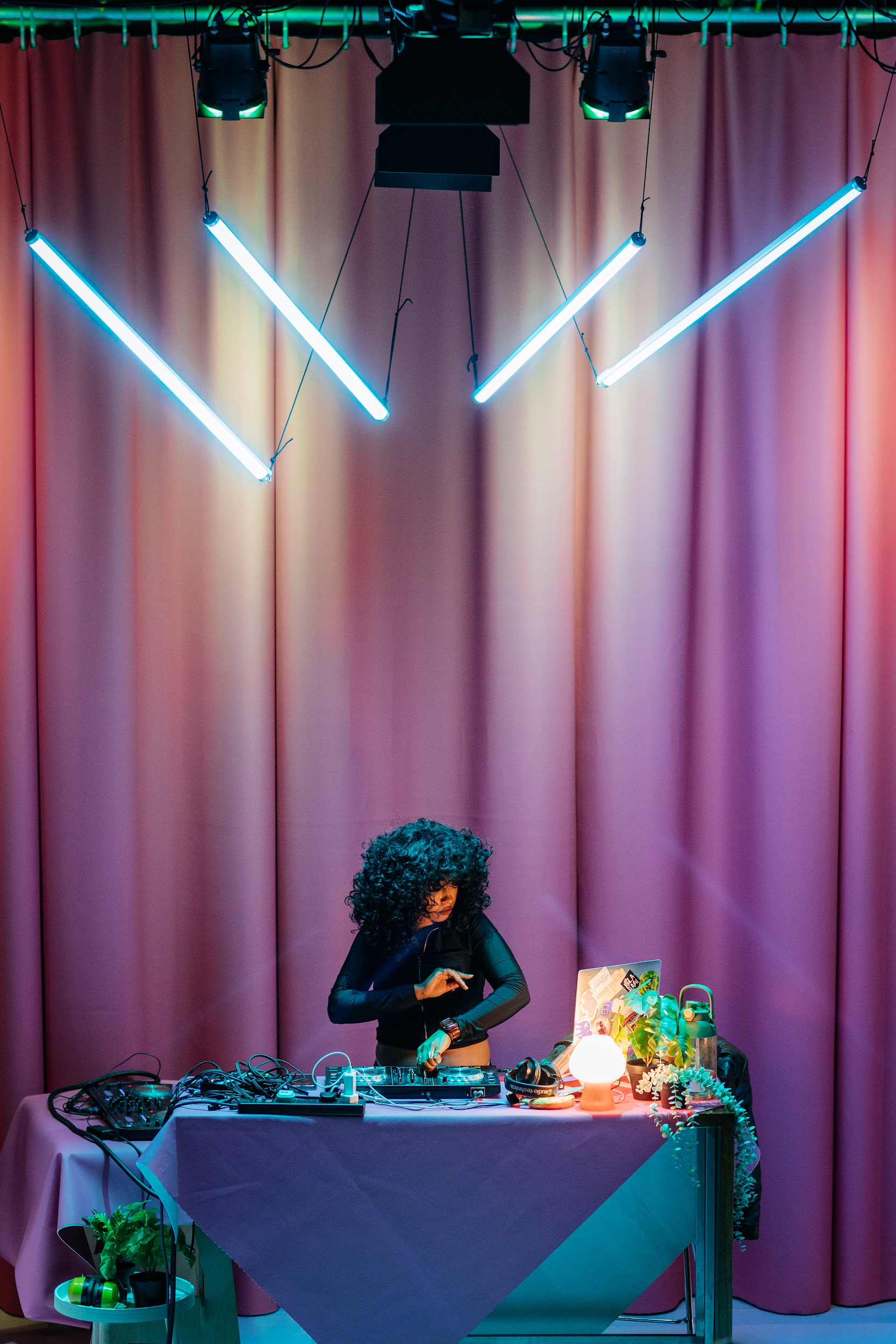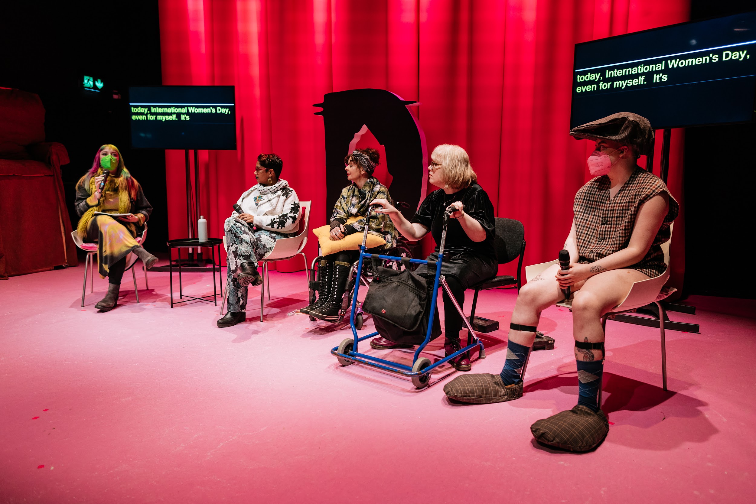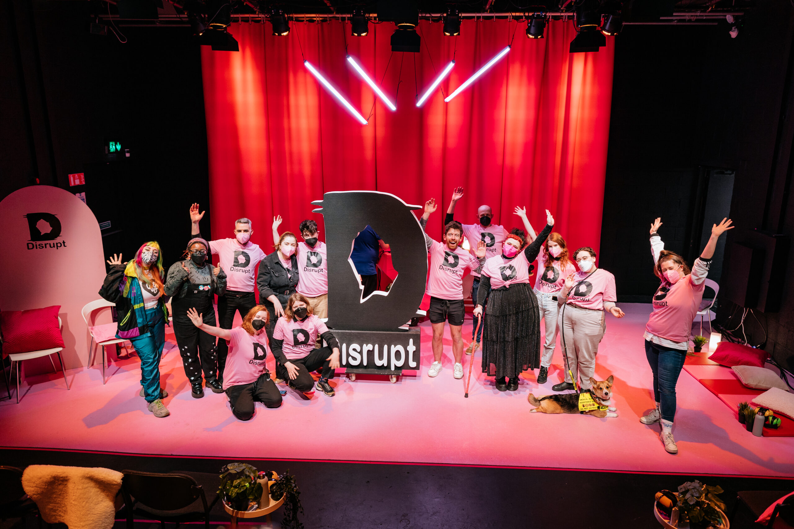 Disrupt festival organiser, sits amongst a crowd. They wear a pink t-shirt and face-mask. They gaze toward a stage, with an expression of delight. They are lit in hues of blue. Photo by Leanne Sullivan.Performance artist Suzanne Walshe in action upon a stage. They are standing in blue lighting. They wear ceremonial dress, a ruffled black cloak, birdlike, with a tall headdress. Suzanne stands with a comically serious look on their face. Suzanne’s arms are spread, as if they are about to take flight. Photo by Leanne Sullivan.A person captured from the knees down. They stand on a pink carpet. They wear blue jeans, floral socks and pink Dr Martin shoes. On the back of their calves are paper cutouts. Bright pink in colour, the shape flame or floral like. Photo by Simon Lazewski.An image of artist Ali Clarke performing. Ali is turned slightly away from the camera, and we get her side profile. She is a white woman with long brown hair with a fringe. She wears a white sleeveless blouse and has her two arms outstretched in motion. She is well lit and behind her we see a projection of the Disrupt logo on a screen with pink and red hues. Photo by Simon Lazewski.Two feminine figures stand on a stage. One, in blue wearing a face mask looks to the other, while speaking into a microphone. The other person, artist Yvonne Condon looks outward. They are wearing a yellow hoodie. Behind Yvonne is a large styrofoam D. The artist Yvonne holds up a small white piece of paper. Photo by Leanne Sullivan.In the lobby of Project Art Center is a sign which is propped up on a table. The sign reads “Rest Area” it also has a Navicode image on it. Other objects on the table include. A plant, two bottles of hand sanitiser and two stim toys, one the shape of a rainbow, the other a pink ball.Performance artist Suzanne Walshe on stage in action. They are standing in blue lighting. They wear ceremonial dress, a ruffled black cloak, birdlike. A tall head dress . Suzanne speaks dramatically into a microphone. Photo by Leanne Sullivan.Performance artist Suzanne Walsh stands on a stage. They are dressed in a cloak of black ruffles and a tall head-dress. Graphic red makeup around their eyes. They hold their mouth in a puckered formation, as if whistling. They are lit in tones of blue. Photo by Leanne Sullivan.Poet Chandrika Narayanan- Mohan stands spotlit on a stage. She is reading from a book, her gaze meeting us. She has a smile on her face. She is dressed in a white jumper and wears a Palestinian keffiyeh scarf. Photo by Simon Lazewski.Them Fatale, a character, sits on a comically oversized chair in a deep orange, facing the camera. They are a person with short fair hair and light skin. They are wearing a brown, orange, and cream tartan plaid baggy waistcoat, with black straps around their lower legs and oversized slippers in similar colours and material. They are holding an object made of the same materials on their right leg. Photo by Simon Lazewski.The image shows artist and curator AlanJames Burns standing with two people on either side, all facing the camera and smiling with arms around each other. Alan is dressed in a pink t-shirt featuring the Disrupt Disability Arts Festival logo. In the background and out of focus, an open door reveals a busy city street at night. Photo by Leanne Sullivan.A collection of ear defenders, on a shelf in the discovery section at Project Art Centre. Photo by Simon Lazewski.A crowd sit in tiered seating. They tentatively await a performance. The house lights are up. Everybody wears face masks. Photo by Simon Lazewski.Four figures on the Disrupt festival stage. An ISL interpreter, spotlit. Festival organiser Alan James burns, who is standing gestures with animation toward the audience. Seated is Blezzing Dada, wearing Black dungarees and a facemask. Next sits writer Louise Bruton who is beaming radiantly. The scene is lit in hues of pink. Photo by Simon Lazewski.Writer Louise Bruton on stage. Lit in Pink Hues. Louise has tumbling blond curls. She wears black jeans, a black blazer and a pink satin corset. She is seated in a wheelchair with a laptop on her knee. On her face is a deep, warm expression. Photo by Simon Lazewski.Artist Christopher Bailey stands in front of a pink curtain. He wears a suit jacket, shirt, tie and wide brimmed hat. He leans on a cane, gazing outward in a confident and content manner. Photo by Simon Lazewski.An image of dance artist Ali Clarke performing on stage. She stands in front of a purple background. Alison contorts her body, leaning deeply backwards in motion. She stands balancing, with one arm stretched outward as if trying to grasp something unseen. Photo by Simon Lazewski.A figure wearing pink, is sitting at a desk which is covered in coloured paper, marker and magazine cuttings. They are making a zine. They have pale tattooed arms and wear a t-shirt with pink lettering. Photo by Simon Lazewski.Artist Mairéad Folan stands on a stage lit in purple and pink hues. She is dressed all in black and leans on a black walking frame. They engage with an audience, who are mostly unseen. The stage is lit in purple and pink hues. Viewed from a diagonal perspective within the audience area, silhouetted spectators sit facing the stage. In the background there is a projection screen displaying the logo for the Disrupt Disability Arts Festival. Photo by Simon Lazewski.A table with plants, lights, a pink covering and DJ equipment is set up on the Disrupt stage. DJ Renn Miano plays a set. Renn has voluminous dark curls and is concentrated on their work. Renn wears a black lycra zip top. They are lit in pink, blue and green hues. Behind Renn is a pink curtain and a large styrofoam D, the disrupt logo. Photo by Simon Lazewski.A collection of stim toys, ear defenders, a water bottle and plants, organised on a mat. Photo by Simon Lazewski.Disrupt festival associate Adrian Colwell stands behind a tall desk in a busy lobby. He is reading from a laptop. He wears a blue denim sh